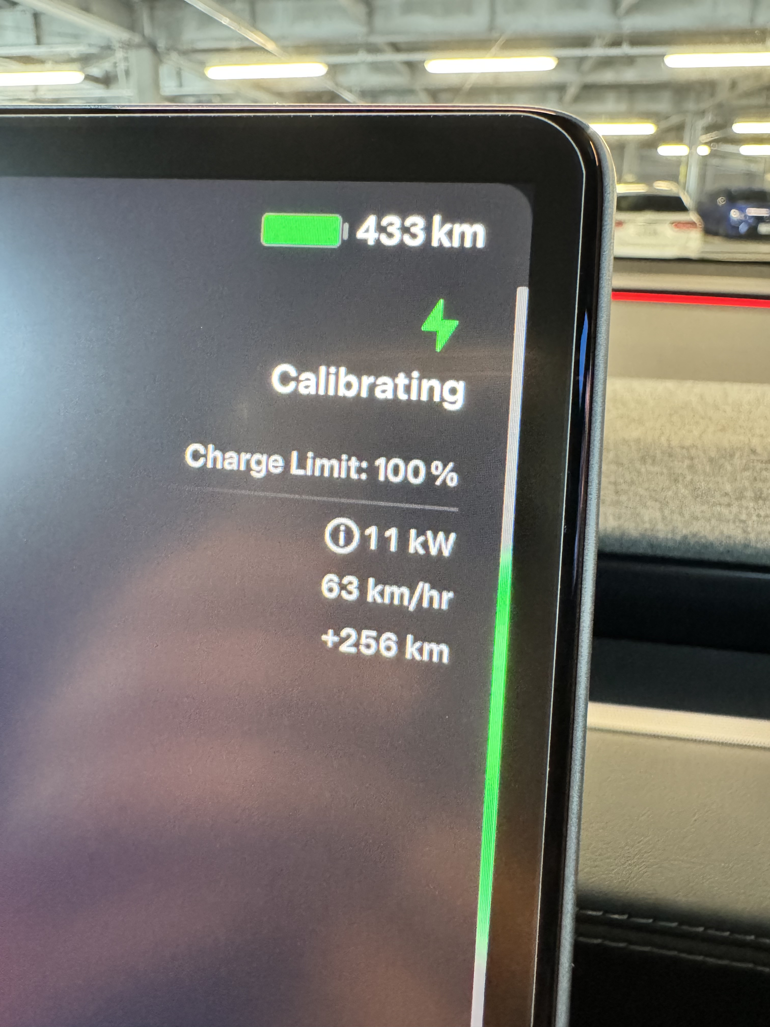 週末納車後今日初めて満充電しました。表示は100%だったのですが、433キロしか表示されていません。