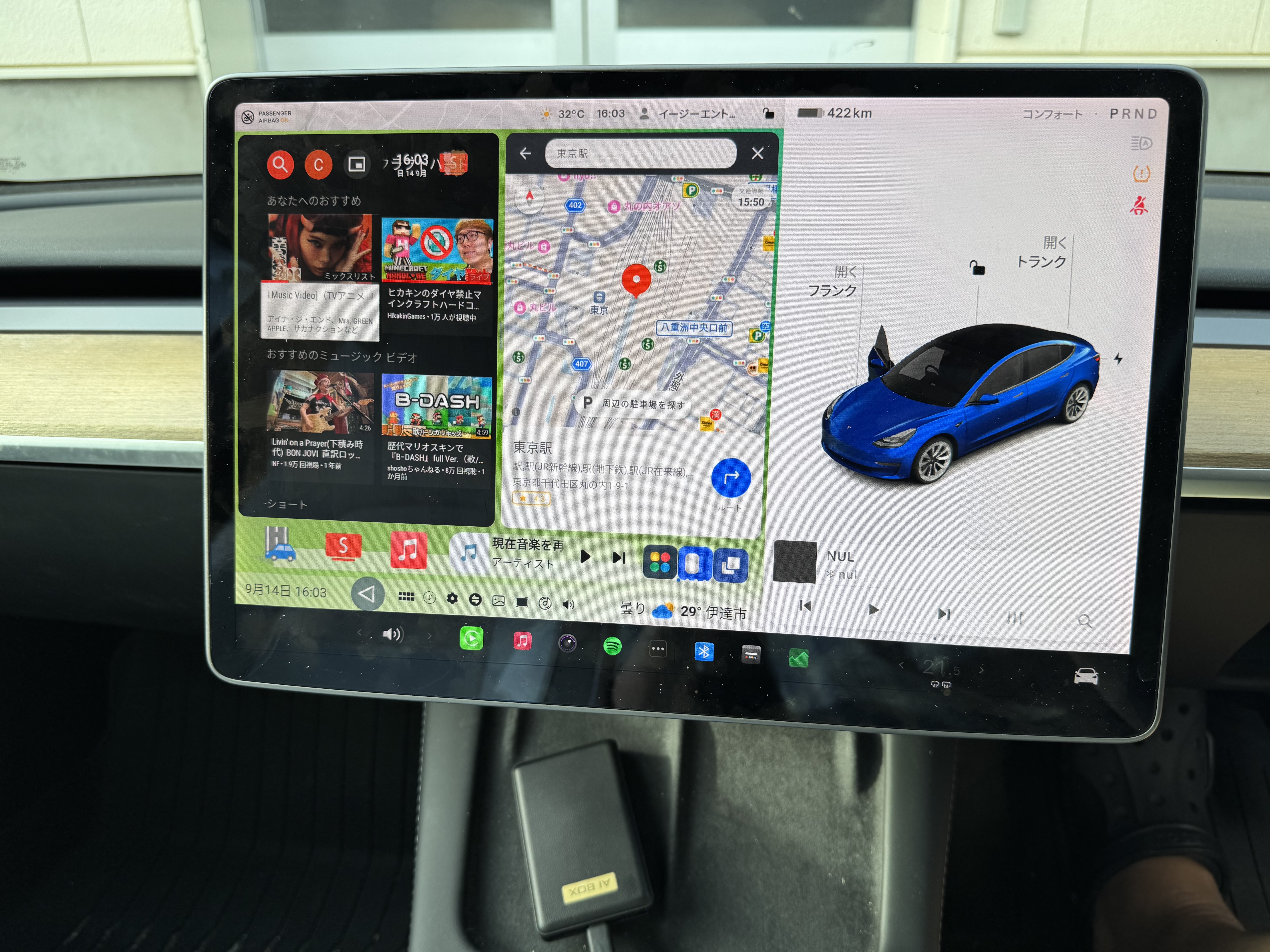 しかし、この製品はCarPlay/AndroidAutoの有線接続にも対応しているところに着目してまして、つまり、別途AI Box等の製品を買ってきて繋げると、悲願だったテスラにAI Boxが付くのだ!と信じております。当然、AI Boxならば各種動画アプリが自由に使えますし、GPSを搭載しているならカーナビアプリもスマホのものがフル機能で使えてしましますよね。