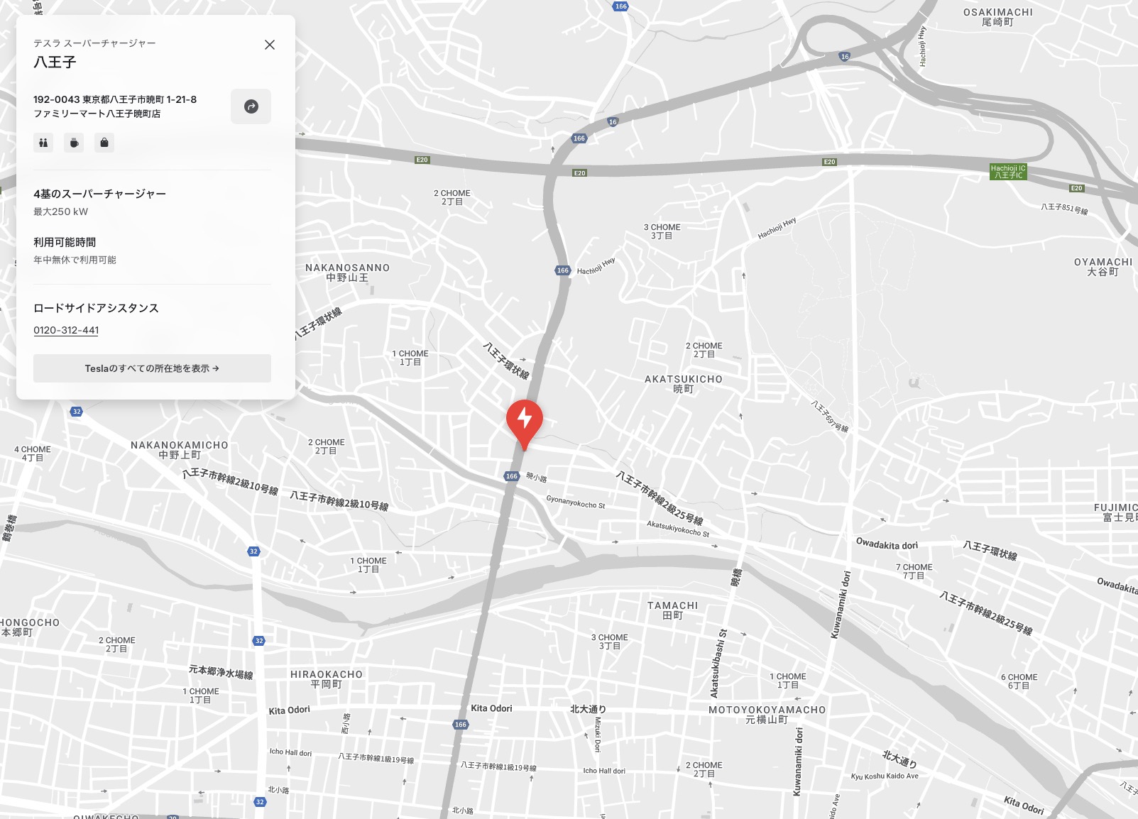 スーパーチャージャーがオープンすると、以下のページや、テスラアプリ内の「場所」→「充電」などに反映されます。