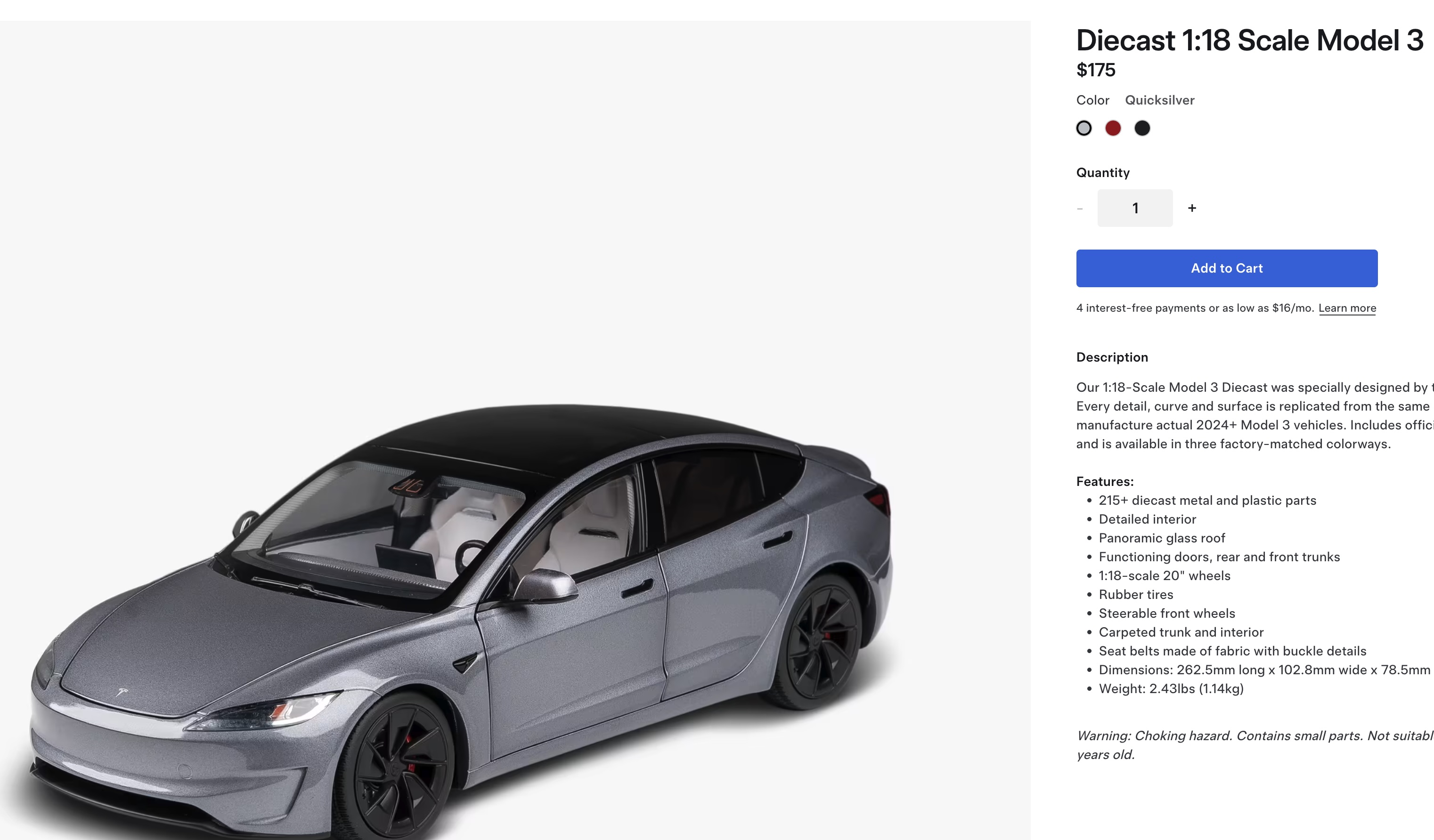 モデル3ハイランドのミニカー、USのテスラストアだと、黒と赤の他に、クイックシルバーも選べますね