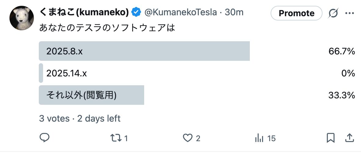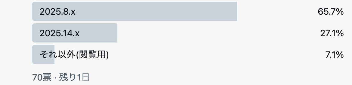Xのアンケートのほうは途中経過ですが、2025.14.xが未配信の方が多いですね。