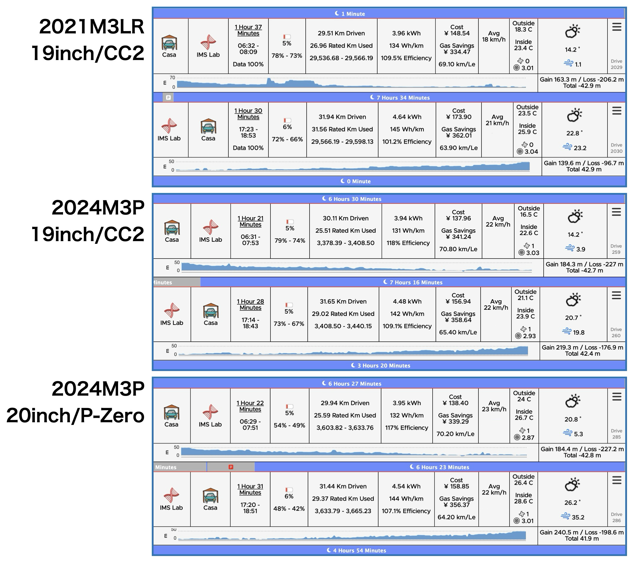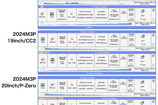 参考までに前車の2021M3LRと現車の2024M3Pとでほぼほぼ同じ往復60kmの道程での電費比較を置いておきます。