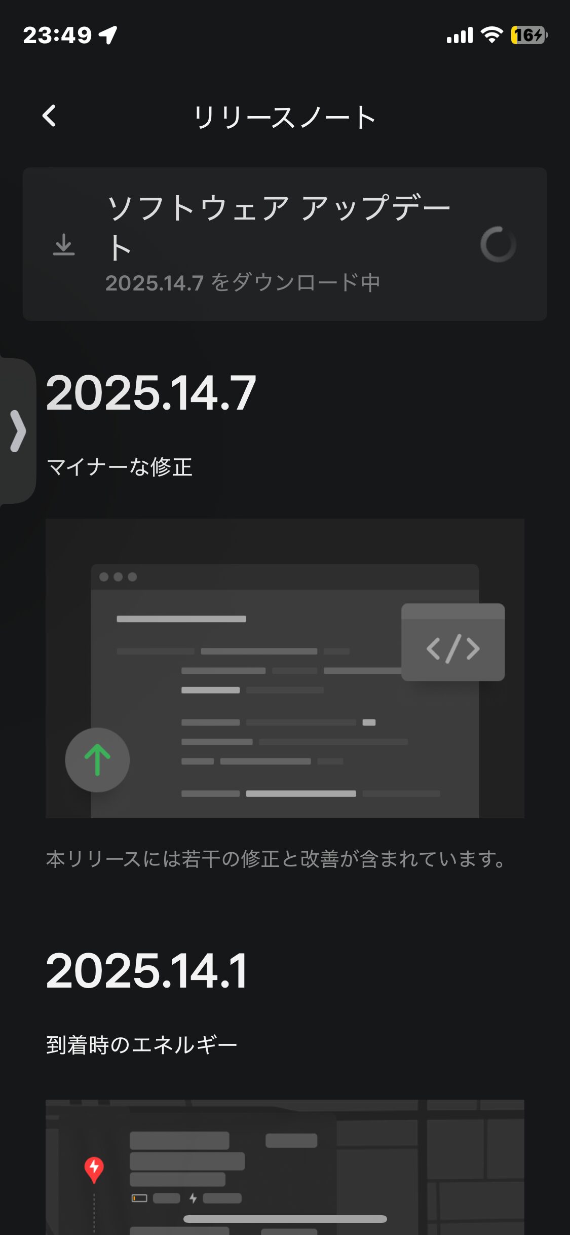 どうやら2025.14.7のアップデートが来てるようです。ハイランドオーナーには来始めているとのこと!アプリ確認してみてくださいー