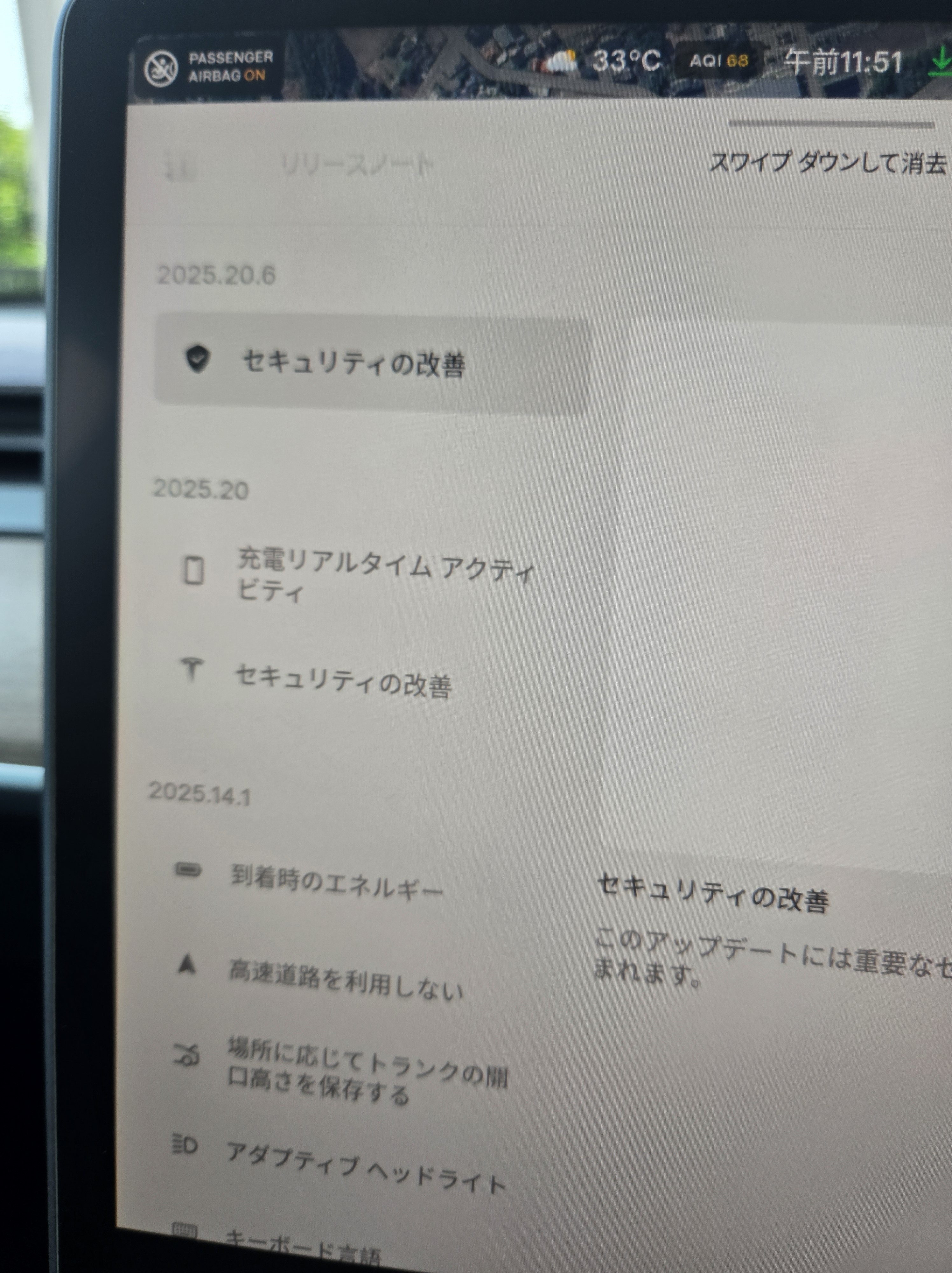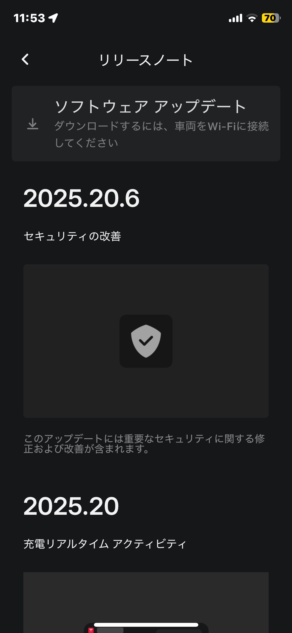 2025.20.6アップデートが来た! 2025.07.03 トップ › トップ › 雑談 › 2025.20.6アップデートが来た! このトピックには2件の返信、2人の参加者があり、最後にᏚᏌᎷᎷᎬᏒにより5ヶ月前に更新されました。 3件の投稿を表示中 - 1 - 3件目 (全3件中) 投稿者 投稿 2025年7月3日 11:49 #89700 FUMIchi_JP テスラ紹介コード: https://www.tesla.com/referral/fumiya219756 ついに来ましたね! アプデ中です! Attachments: 2025年7月3日 11:51 #89702 FUMIchi_JP テスラ紹介コード: https://www.tesla.com/referral/fumiya219756 リリースノートの中身はこんな感じ…。 Attachments: 2025年7月3日 11:59 #89704 ᏚᏌᎷᎷᎬᏒ テスラ紹介コード: https://ts.la/koki165872車: Model 3 Highland LR AI4×Ryzen URed×White 私にも来ました。 Grokは入ってなさそうですね。 Attachments: 投稿者 投稿 3件の投稿を表示中 - 1 - 3件目 (全3件中) トピック「2025.20.6アップデートが来た!」には新しい返信をつけることはできません。