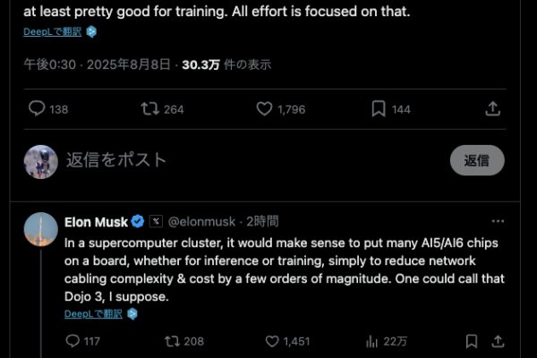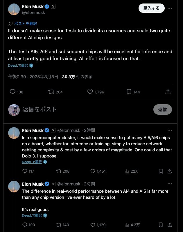DojoカスタムチップとAI5/6の並行開発は非効率という結論になったようですね。今後はトレーニングもAI5/6のクラスタで行い、これをDojo3と呼ぶかもしれないと言ってます。