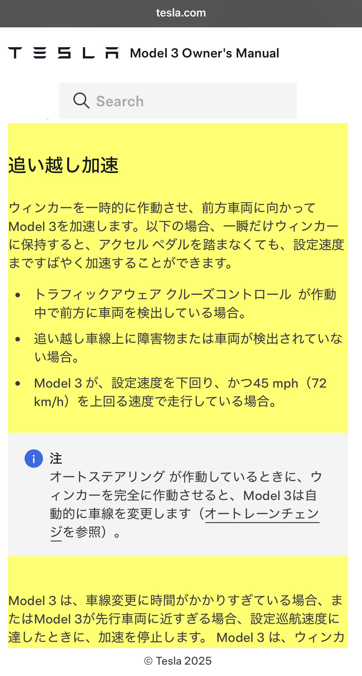 モデルY+EAPにのっています。先日、埼玉から岡山に帰省のためモデルYで高速で長距離をのっていましたが、オートパイロットON時で追越車線への車線変更時、元いた車線で設定速度以下の場合は隣の車線へ移る瞬間自動で速度を上げてることが何度かあり、新しい機能なのかな?と思っていたところでした。参考までに、特に特別なウインカー操作などはしていませんでした。
