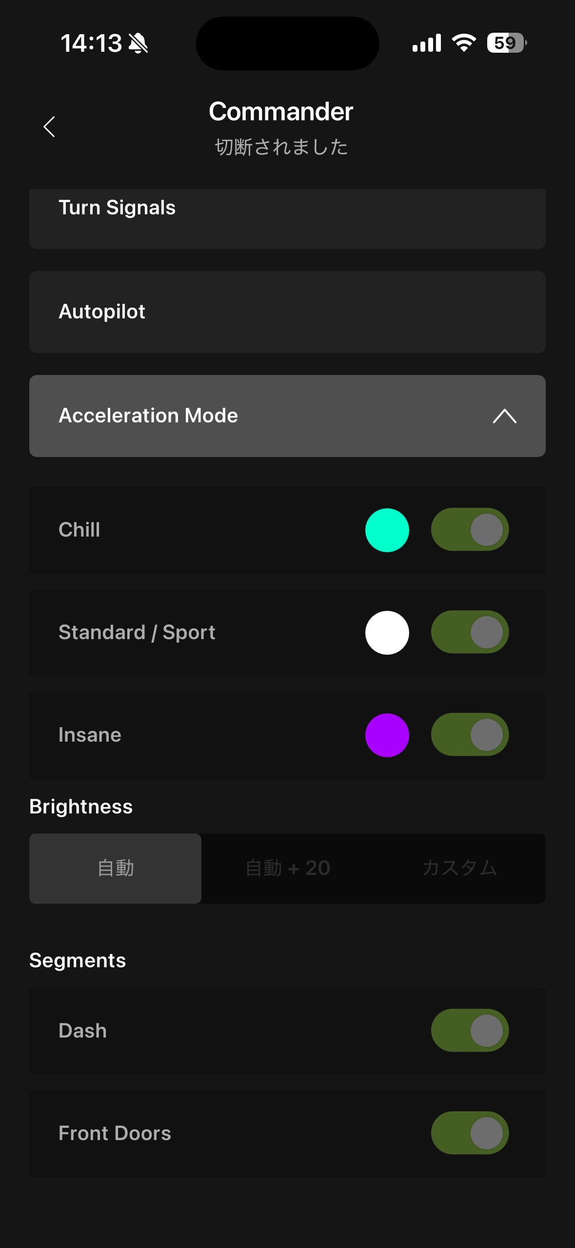 S3XY commanderを付ければ、どの走行モードでもアクセルベタ踏みでインセインに入るキックダウンが使えるようになります。アンビエントライトがついていればその時紫(デフォルト)に光ります(笑)。