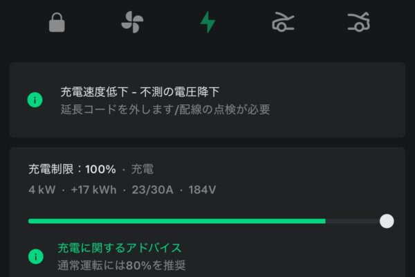 DMM EV ONのもこれが原因な気がしていますが、標高の高めなところで30度前後とそこまで悪い環境でも無かったのに4kW下がってしまって不服です(特に気温が下がったわけでもないのに最後の1時間だけは6kWに自然回復したのも謎でした)。> 自宅に充電器は無く、普段の充電はすべてSCですが、バッテリーには普通充電の方が優しいと聞いて、出先での普通充電のトライを始めたという背景です。