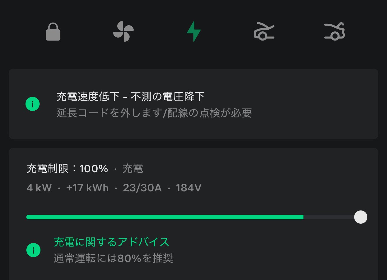 どちらも充電中の電圧が190~200V、電流はほぼ30Aでしたので、それほどの出力変動は無かったと思います。モデル3ハイランドLRで、サードパーティのアダプタ使って充電してますが、6kwでてますね。