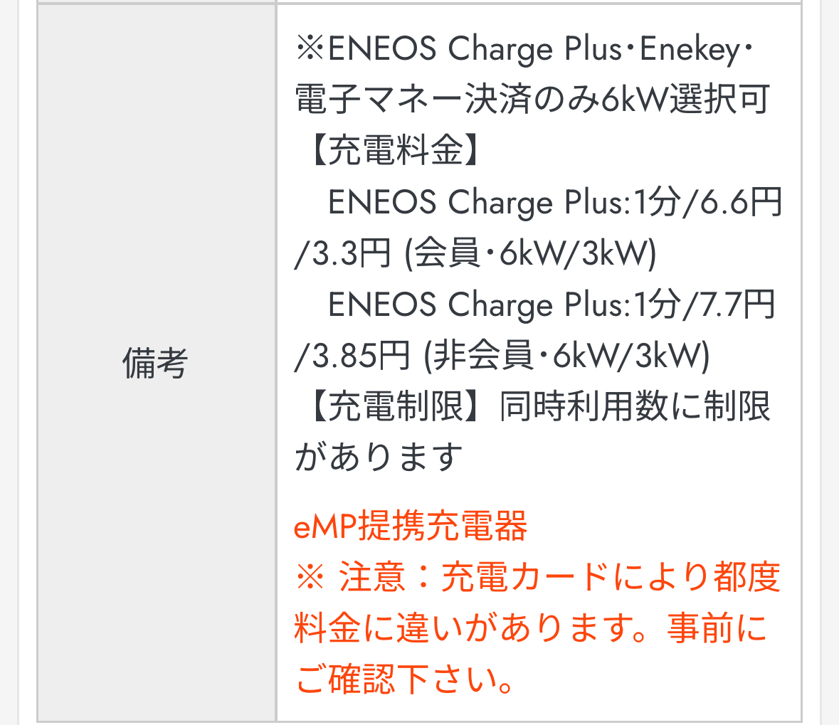 ENEOSの金額はENEOSアプリか、ENEOSの非会員(というのがなんなのかよくしりません)でないと、6.6円とか3.3円とかにならないとか?7.7円はENEOSの料金表にはない値段です。非会員は3kWだけですし。反論ではなく、ただの情報として