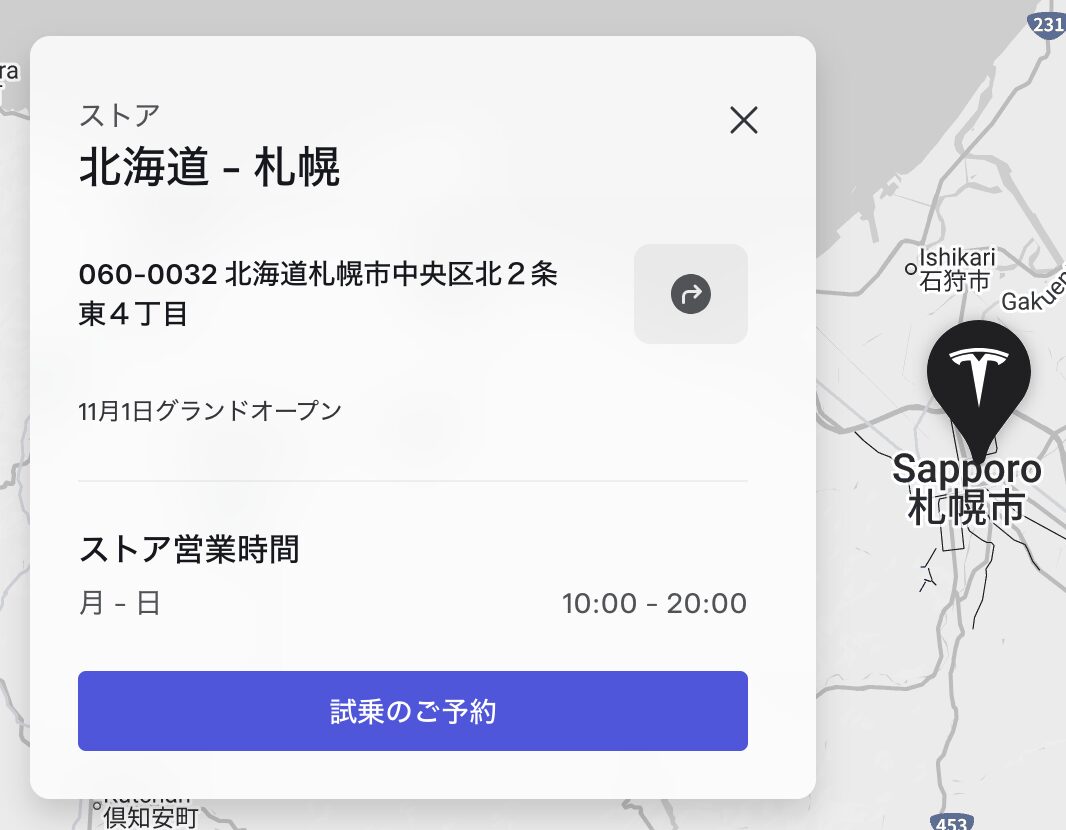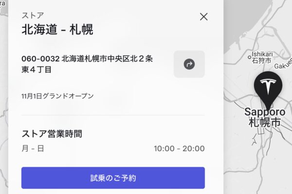 テスラストア札幌11/1オープン 2025.10.15 トップ › トップ › テスラニュース › テスラストア札幌11/1オープン このトピックには1件の返信、2人の参加者があり、最後にダテクスにより1ヶ月、 3週前に更新されました。 2件の投稿を表示中 - 1 - 2件目 (全2件中) 投稿者 投稿 2025年10月15日 11:37 #94456 返信 くまねこ テスラ紹介コード: https://www.tesla.com/referral/yoshitaro463313車: MODELY LR(2023) 過去何回もcoming soonで止まっていた札幌に テスラストアが出来ます! Attachments: 2025年10月15日 12:29 #94462 返信 ダテクス サッポロファクトリーというショッピングモールに出来るみたいですね。スーパーチャージャーのすぐ近くだ! https://maps.app.goo.gl/WAGCGuXraHTq6DmX8 投稿者 投稿 2件の投稿を表示中 - 1 - 2件目 (全2件中) 返信先: テスラストア札幌11/1オープン あなたの情報: お名前 (必須) メール (非公開) (必須): ウェブサイト: 以下の HTML タグと属性を使用できます。 <a href="" title="" rel="" target=""> <blockquote cite=""> <code> <pre class=""> <em> <strong> <del datetime="" cite=""> <ins datetime="" cite=""> <ul> <ol start=""> <li> <img src="" border="" alt="" height="" width=""> 送信中.... 送信