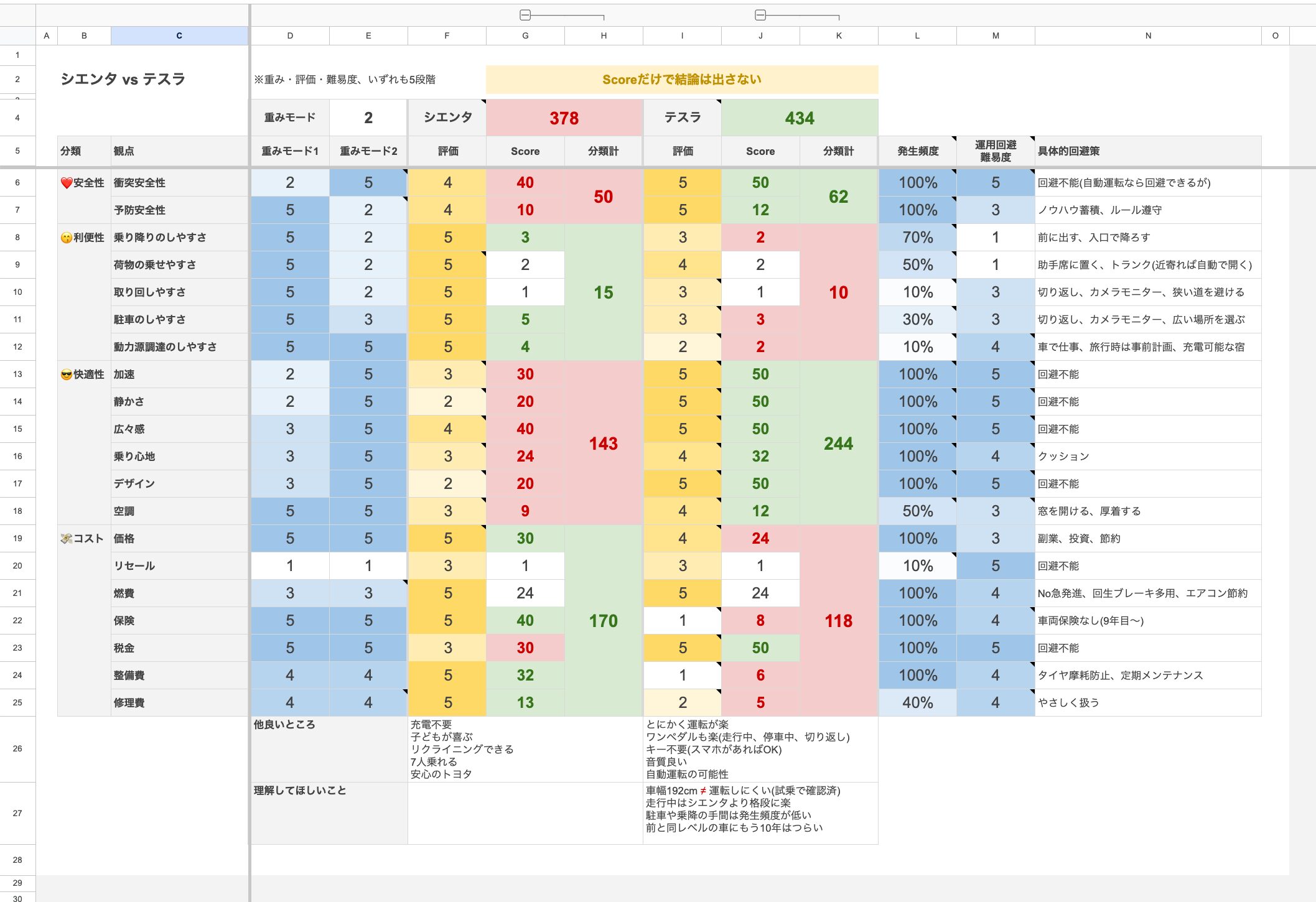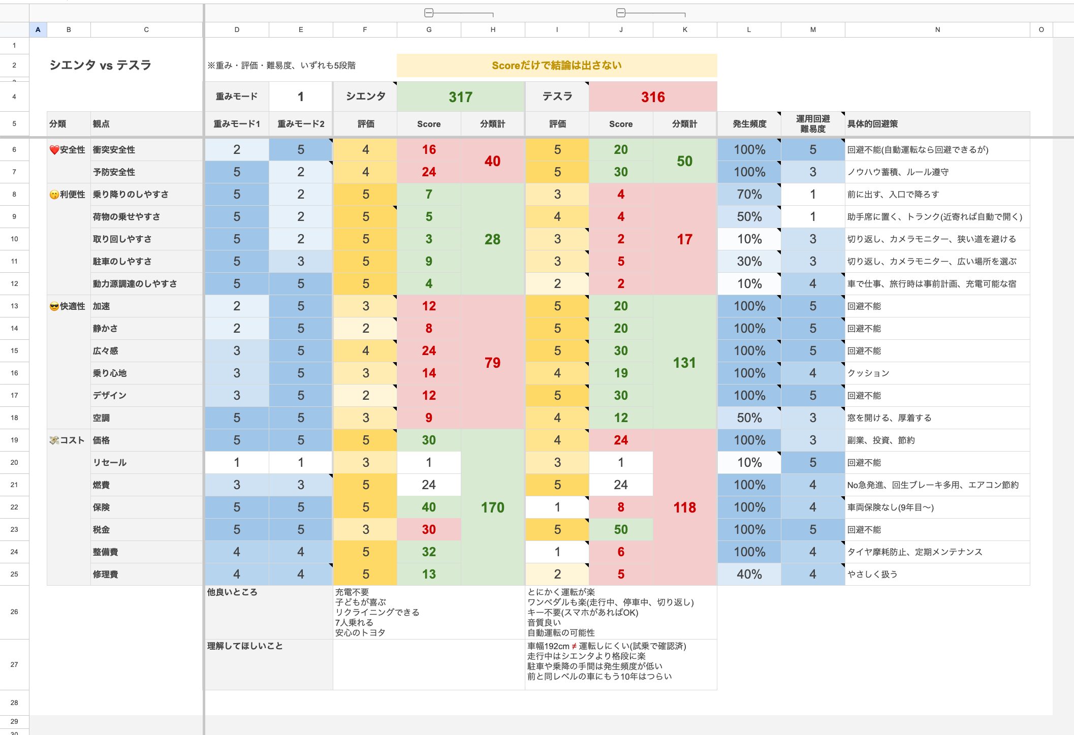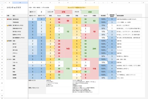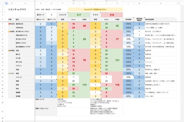 お父さん視点だとシエンタの運転する悦び不足、家族視点だとテスラの取回しづらさ。いずれも決定的な評価軸のため比較にならない事が、なるほど比較表によって明確になったという感じでしょうか。