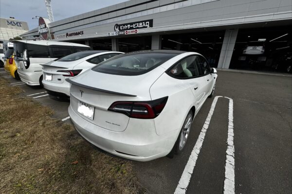 スーパーオートバックスは指定工場(検査のため陸運支局に持って行かなくていい)車検なので大きな作業がなければ数時間で終わり、あまり問題はないかと。敷地内に従量制50kwチャデモはありましたが、工場に普通充電器は確認できませんでした。まあ困ったら近所にあるテスラセンターのスーパーチャージャーを利用すればいいですね。