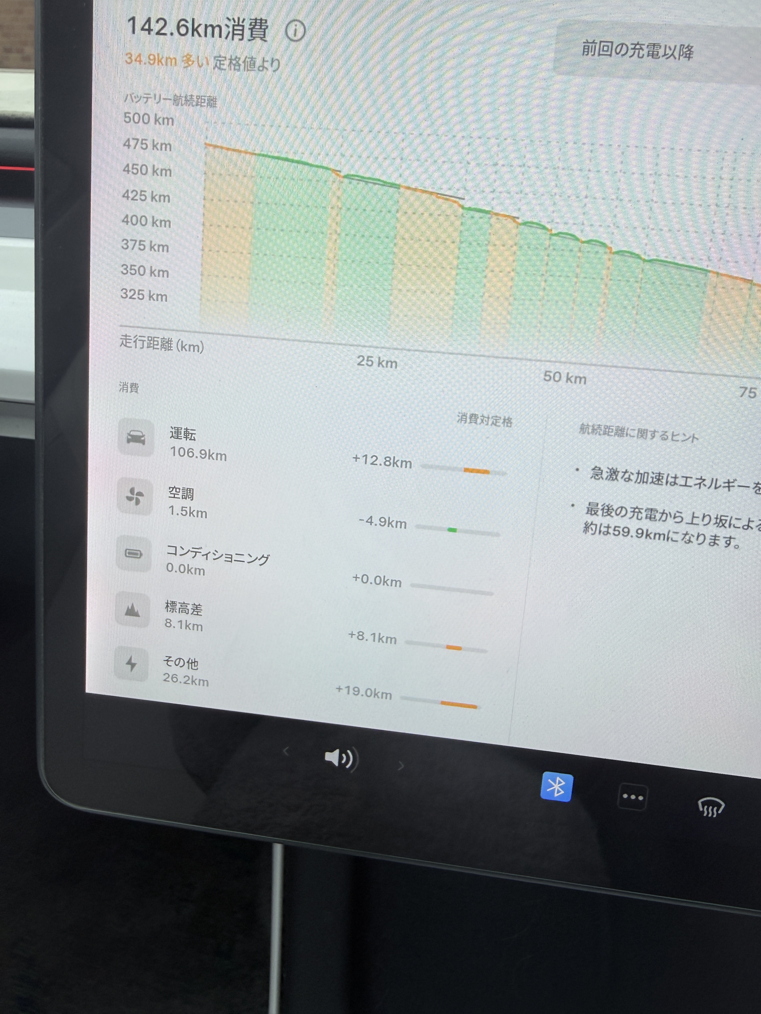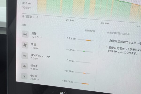 運転で106.9kmに対して、その他が26.2kmになってます。これが理由で電費が悪くなってらのではと思い、テスラサポートに問い合わせしました。