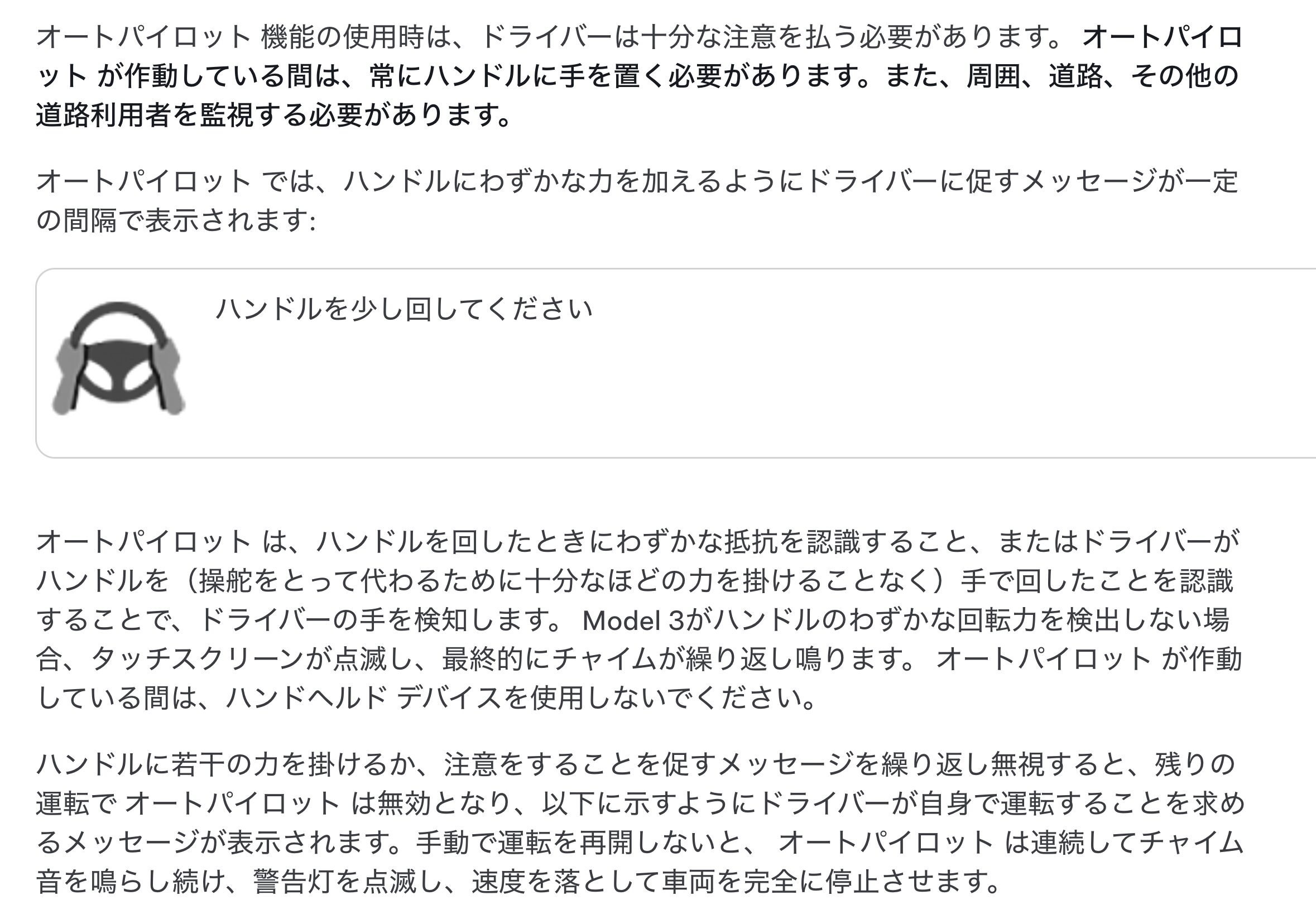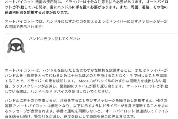 ハンドルを握っているだけでは駄目なんだということをちゃんとオーナーズマニュアルに書いておけばよいのにと思う。