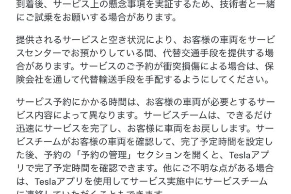 何度も言いますがテスラは既存ユーザーも全ての条件で代車は出ないと言っているのです。しかも私は納車待ちの間の代車サービス終了でした。